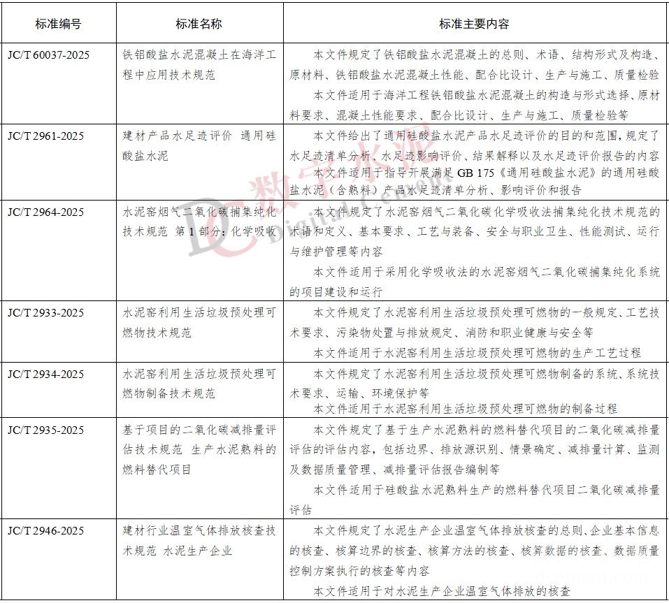 日前,工业和信息化部科技司发布《117项行业标准报批公示》显示,根据行业标准制修订计划,相关标准化技术组织已完成的34项建材行业标准中包括七项水泥行业相关标准,分别是:铁铝酸盐水泥混凝土在海洋工程中应用技术规范、建材产品水足迹评价 通用硅酸盐水泥、水泥窑烟气二氧化碳捕集纯化技术规范 第1部分:化学吸收、水泥窑利用生活垃圾预处理可燃物技术规范、水泥窑利用生活垃圾预处理可燃物制备技术规范、基于项目的二氧化碳减排量评估技术规范 生产水泥熟料的燃料替代项目、建材行业温室气体排放核查技术规范 水泥生产企业。