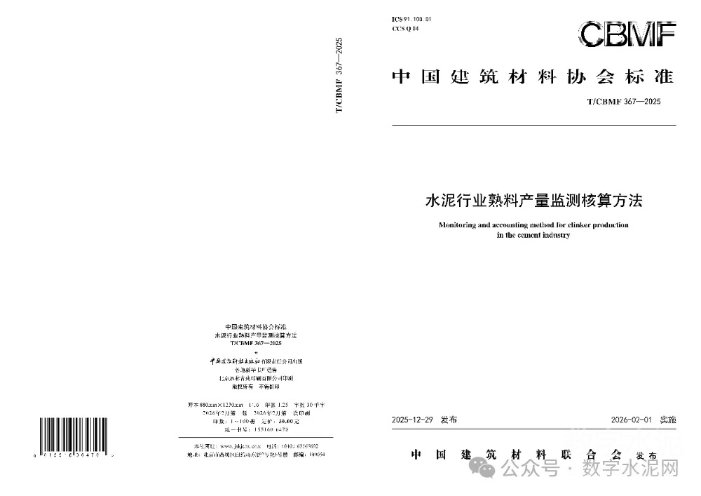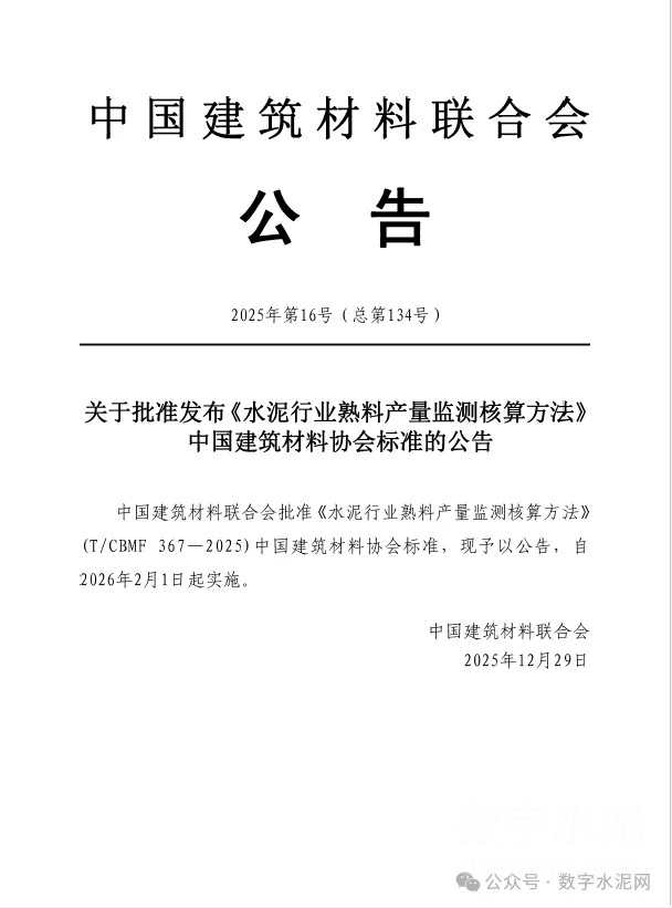 中国建筑材料联合会批准发布《水泥行业熟料产量监测核算方法》(T/CBMF 367-2025)。该标准于2025年12月29日公告发布,自2026年2月1日起实施。
